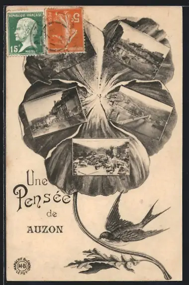 Blumengruss-AK Auzon, Flusspartie mit Brücke, Ortsansicht