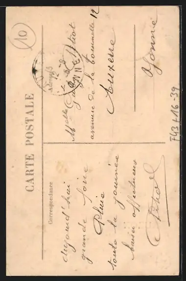 Personenbezogene Daten auf der Rückseite der Karte wurden durch blauen Textmarker unkenntlich gemacht. Die blauen Stellen sind auf die Vorderseite durchgeweicht und wirken sich negativ auf das Postkartenfoto aus