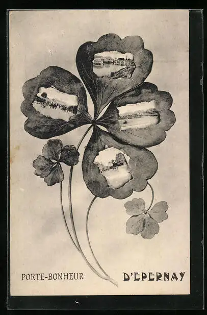 Blumengruss-AK Epernay, Porte-Bonheur, Stadtansichten im Kleeblatt