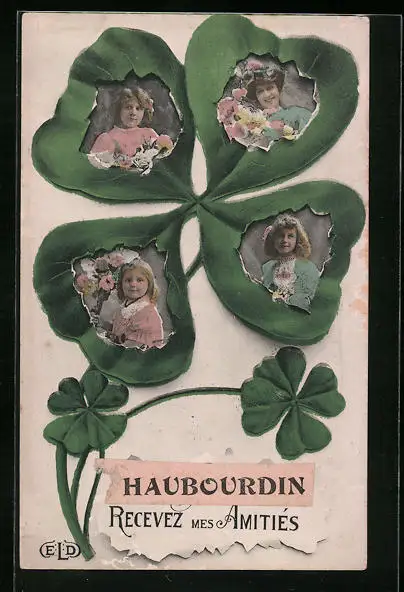 Blumengruss-AK Haubourdin, Mädchenportraits auf Kleeblatt