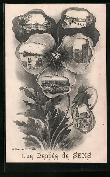 Blumengruss-AK Sens, Vue generale, Le Pont, L`Eglise