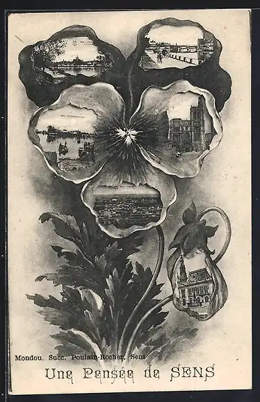 Blumengruss-AK Sens, Vue generale, Le Pont, L`Eglise