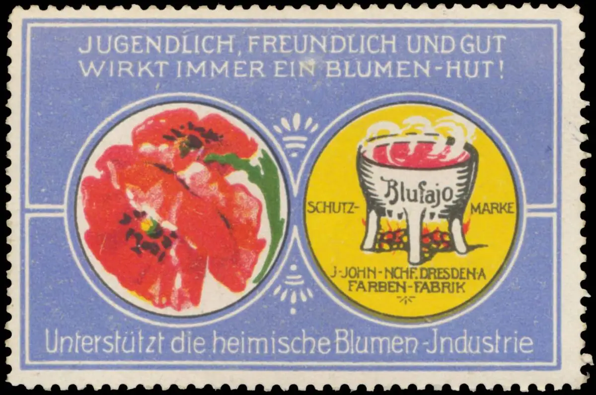 Jugendlich, freundlich und gut wirkt immer ein Blumen-Hut! Unterstützt die heimische Blumen-Industrie. Blufajo, Größe/Zustand: 4x6 , guter Zustand, Original alte Reklamemarke die seinerzeit für die Werbung benutzt wurde
