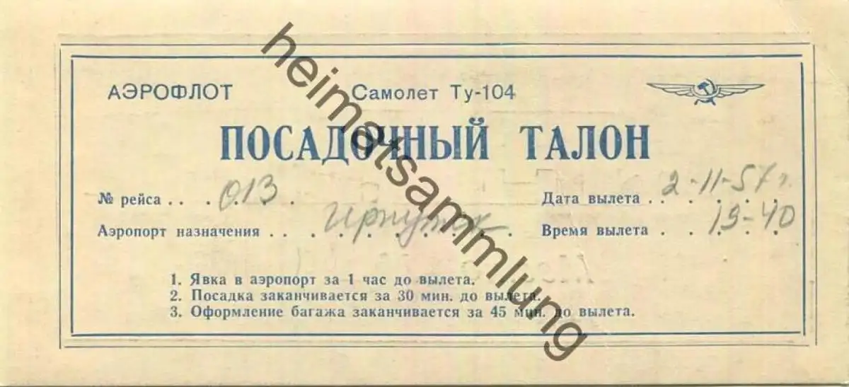 Boarding Pass - Aeroflot 1957 TY-104 (G61542)