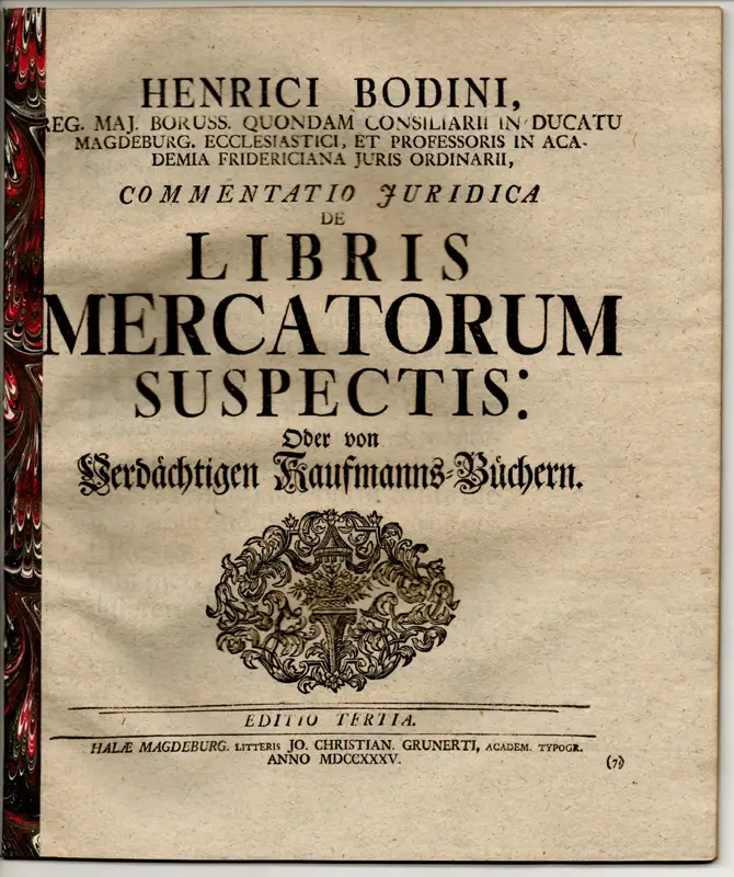 Bode, Heinrich von: Commentatio iuridica de libris mercatorum suspectis oder von verdächtigen Kaufmanns-Büchern, Editio tertia.