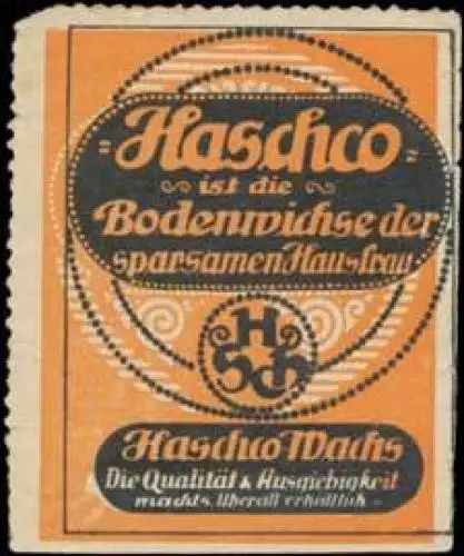 Haschco ist die Bodenwichse der Sparsamen Hausfrau, Haschco Wachs, Größe/Zustand: 5x6 , beschädigt, Original alte Reklamemarke die seinerzeit für die Werbung benutzt wurde