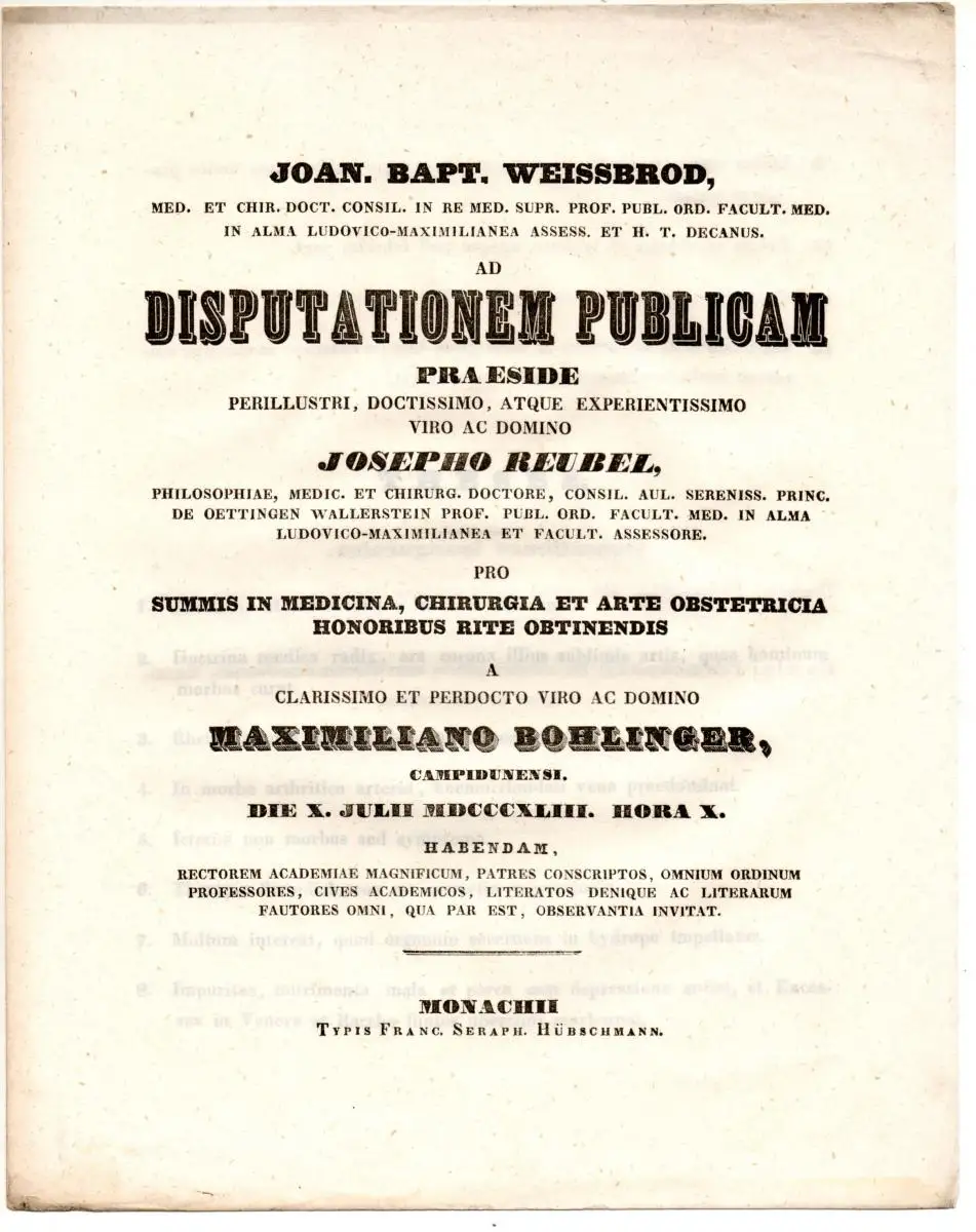 Präses: Joseph Reubel; Disputatio: 1843-07-10; 2 Bl., 25 cm, Staubrand, Rand geknickt.
