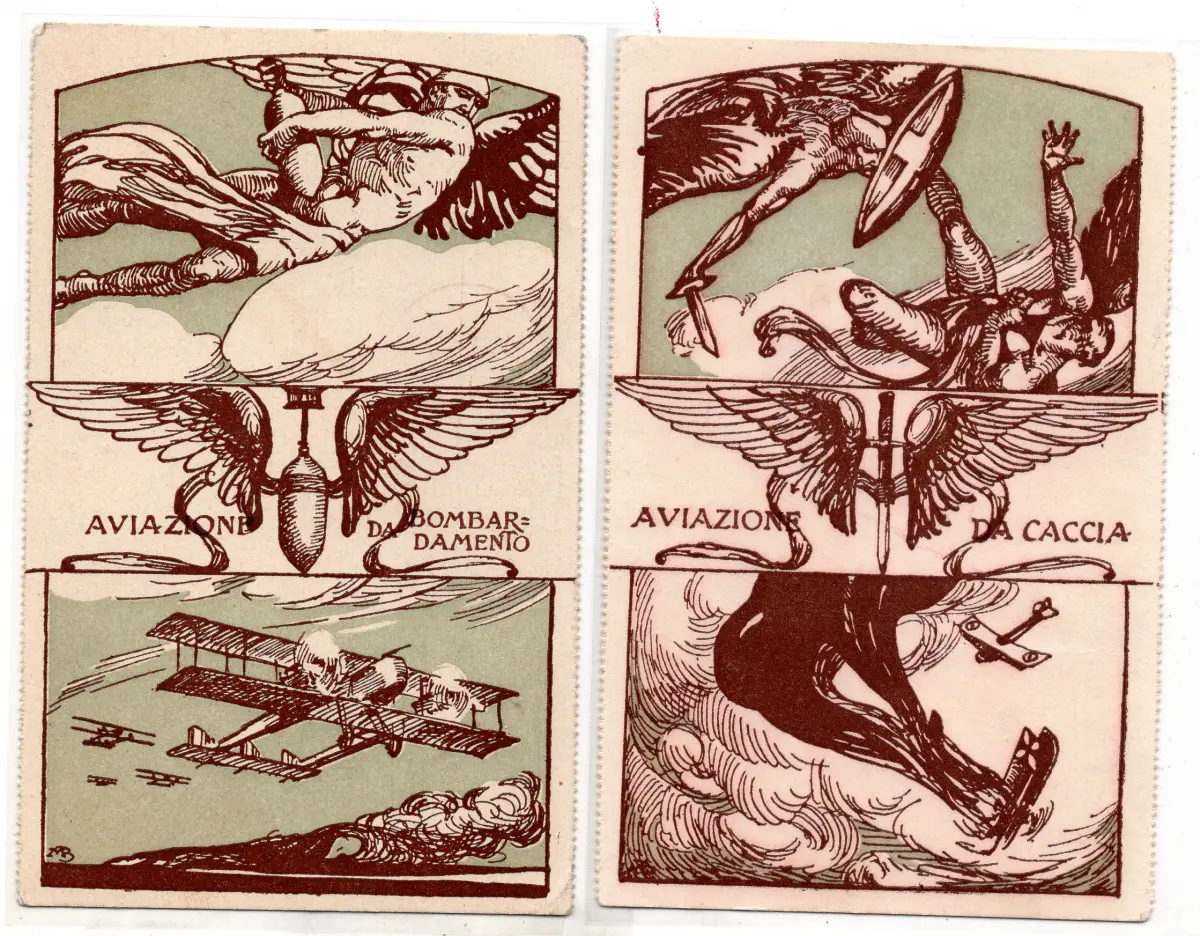 C - Bomben- und Jagdluftfahrt - Zwei schöne Postkarten aus den 20er Jahren für das Luftwaffenkorps, entworfen vom futuristisch inspirierten Soldaten Mario Barberis mit Bombenflugzeug Cod.151/182