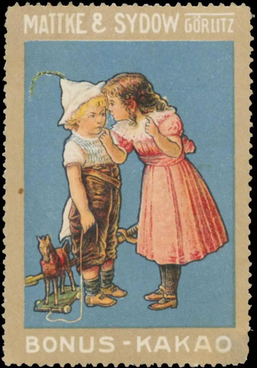 Kinder im Gespräch, Spielzeug, Größe/Zustand: 6x4 , leicht fleckig, Original alte Reklamemarke die seinerzeit für die Werbung benutzt wurde