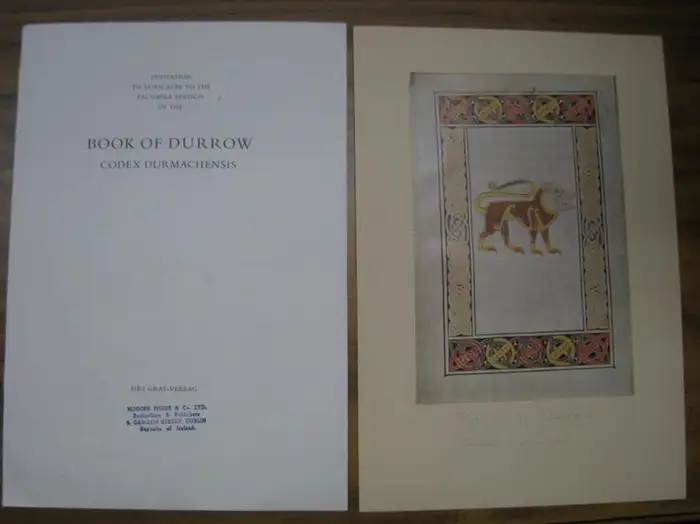 Freie Beschreibung: 34,8 x 24 cm. Originales double-sheet with introducing text. Slightly traces of use and with a stamp of a bookshop. One colored, mounted illustration inside and two b/w photos to the work with very slightly traces of fold (see also other pictures). Furthermore 5 pages written with typewriter titled: - Book of Durrow Press Conference - The codex - written by Professor (Palaeography and Late Latin) Ludwig Bieler, University College, Dublin. Good condition