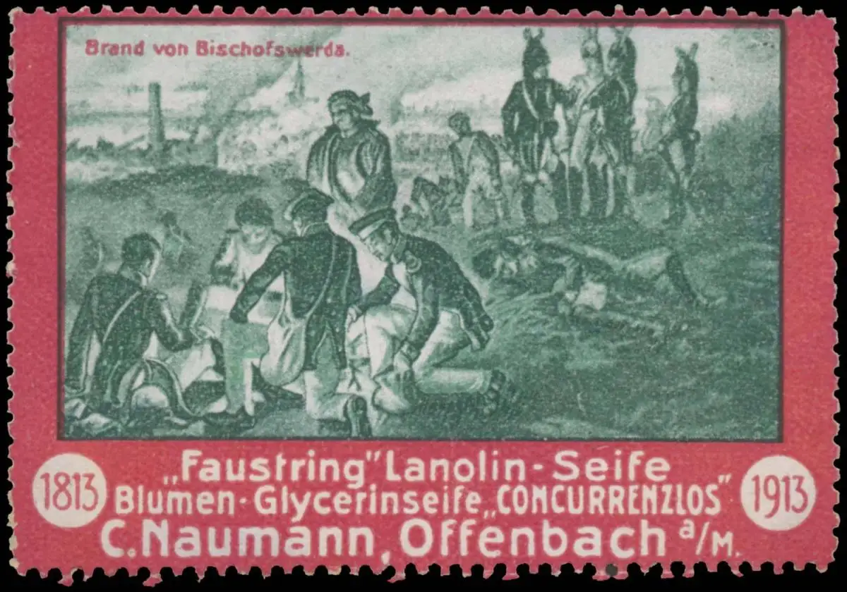 Faustring Lanolin-Seife, Blumen-Glycerinseife Concurrenzlos, Befreiungskriege, Größe/Zustand: 5x7 , guter Zustand, Original alte Reklamemarke die seinerzeit für die Werbung benutzt wurde