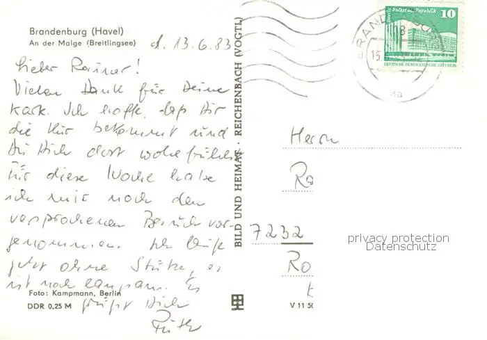 Brandenburg_Havel An der Malge Breitlingsee Brandenburg Havel postalisch gelaufen 1983 Erhaltung siehe scans [WerneD78] WernPID7