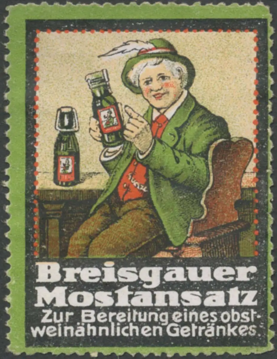 zur Bereitung eines obstweinähnlichen Getränkes, Most, Breisgau, Größe/Zustand: 5x4 , guter Zustand, Original alte Reklamemarke die seinerzeit für die Werbung benutzt wurde