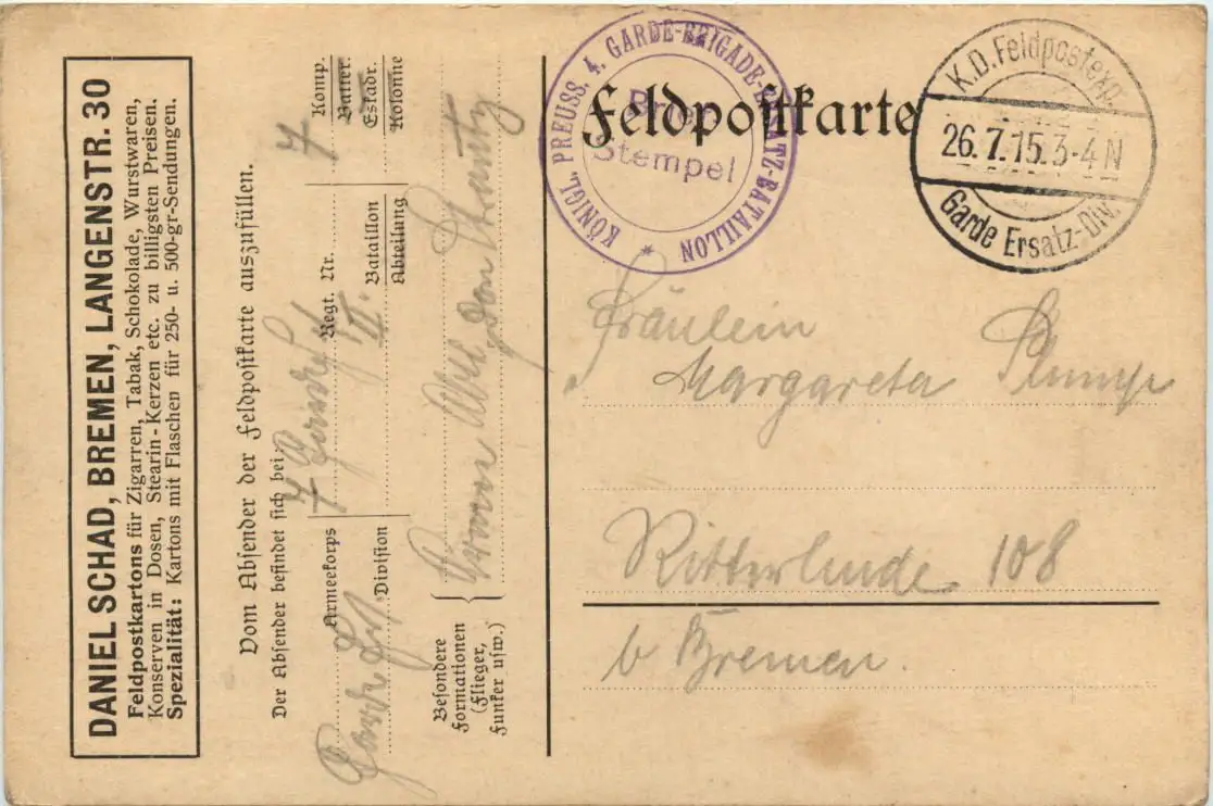Bremen - Feldpost 4. Garde Brigade Ersatz Bataillon -478058