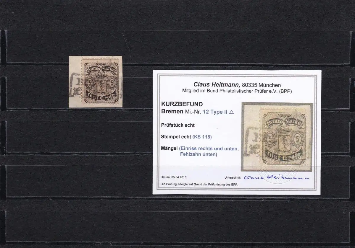Bremen, MiNr. 12, Type II, gestempelt, BPP Befund