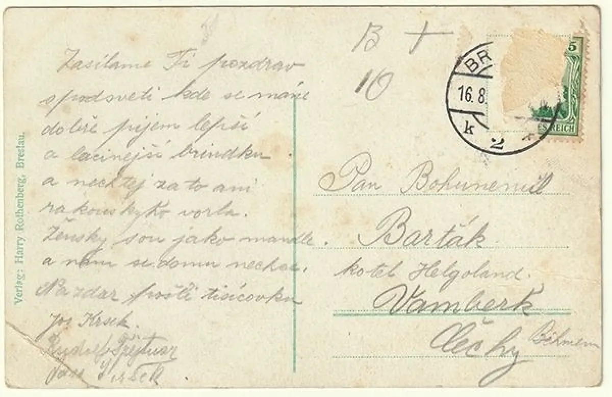 Bemerkungen: Gelaufen von Breslau nach Vamberk [ca.1910]. Marke fehlt.