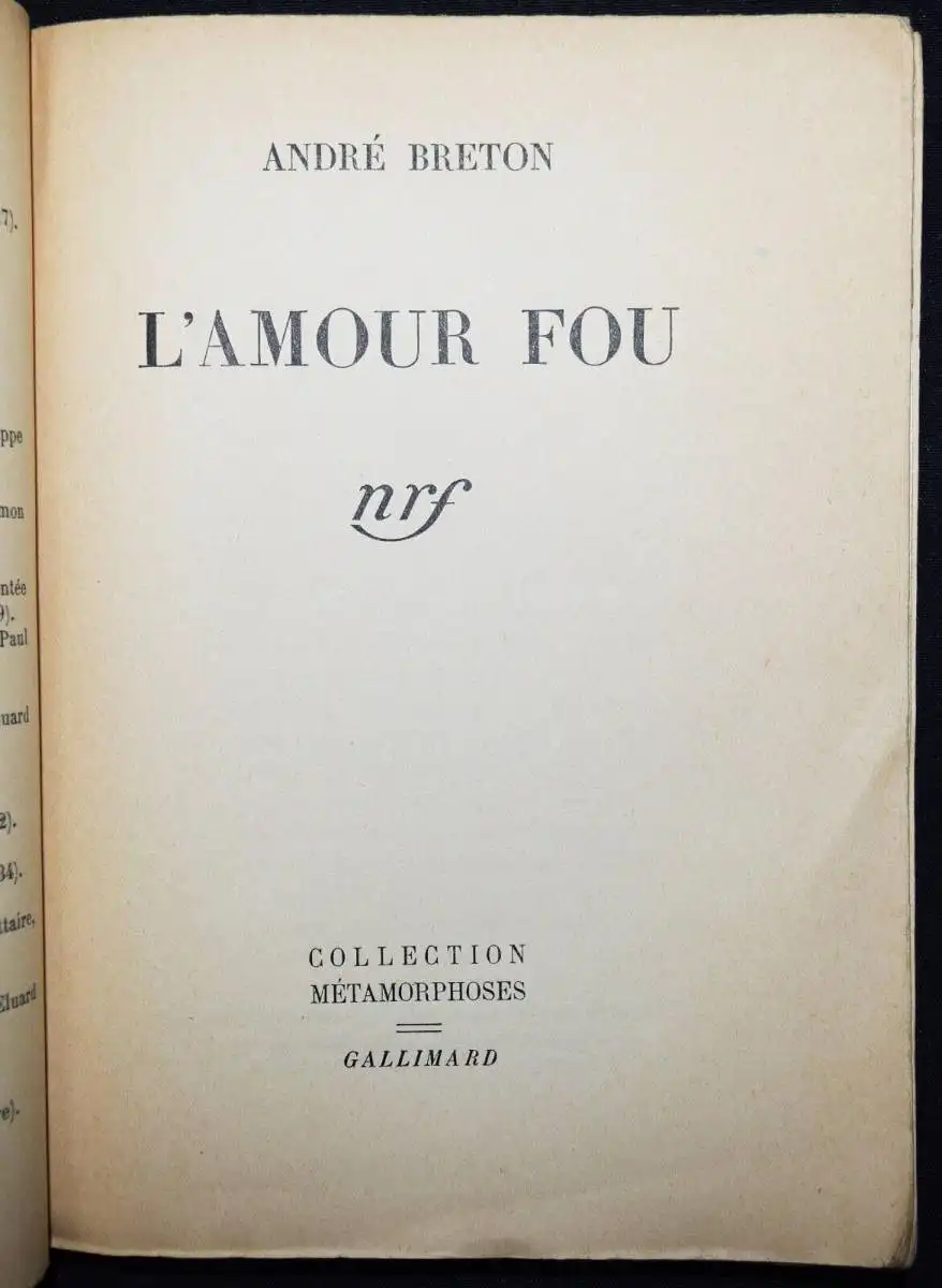 Breton, André. L’ amour fou. Paris, Gallimard (1937). 8°. 176 S., [1] Bl. mit 20 Tafeln. Orig.-Broschurumschlag. (Collection Métaphorses).