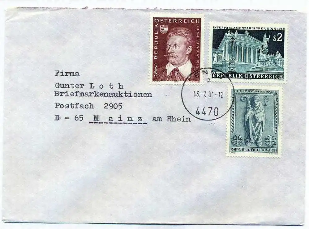 Brief, 13.07.1981, Enns – Mainz, Mischfrankatur, sauber gest., Maße. 16 x 11,5 cm,