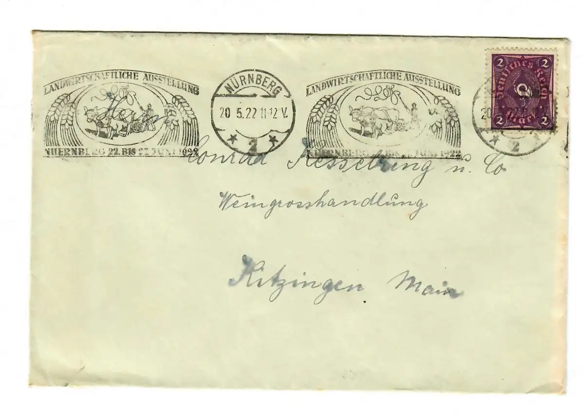Brief 1922 Nürnberg, Landwirtschaftliche Ausstellung, an Weinhandlung Kitzingen