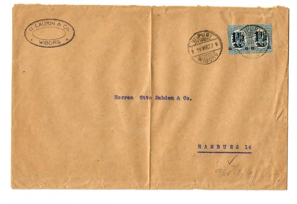 Brief aus Wiborg, 1922 nach Hamburg