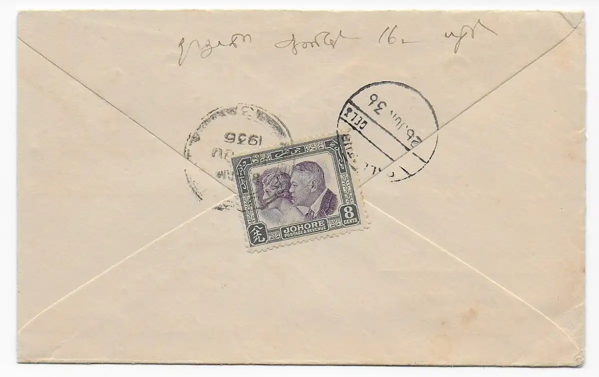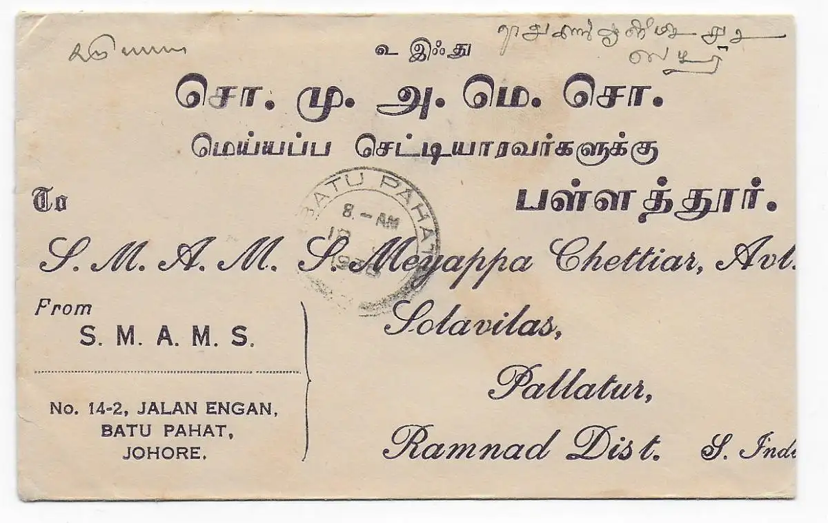 Brief nach Indien Pallatur, Ramnad Dist., 1936, Johore