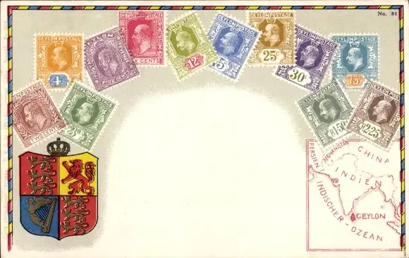 Briefmarken Wappen Litho Ceylon, Landkarte