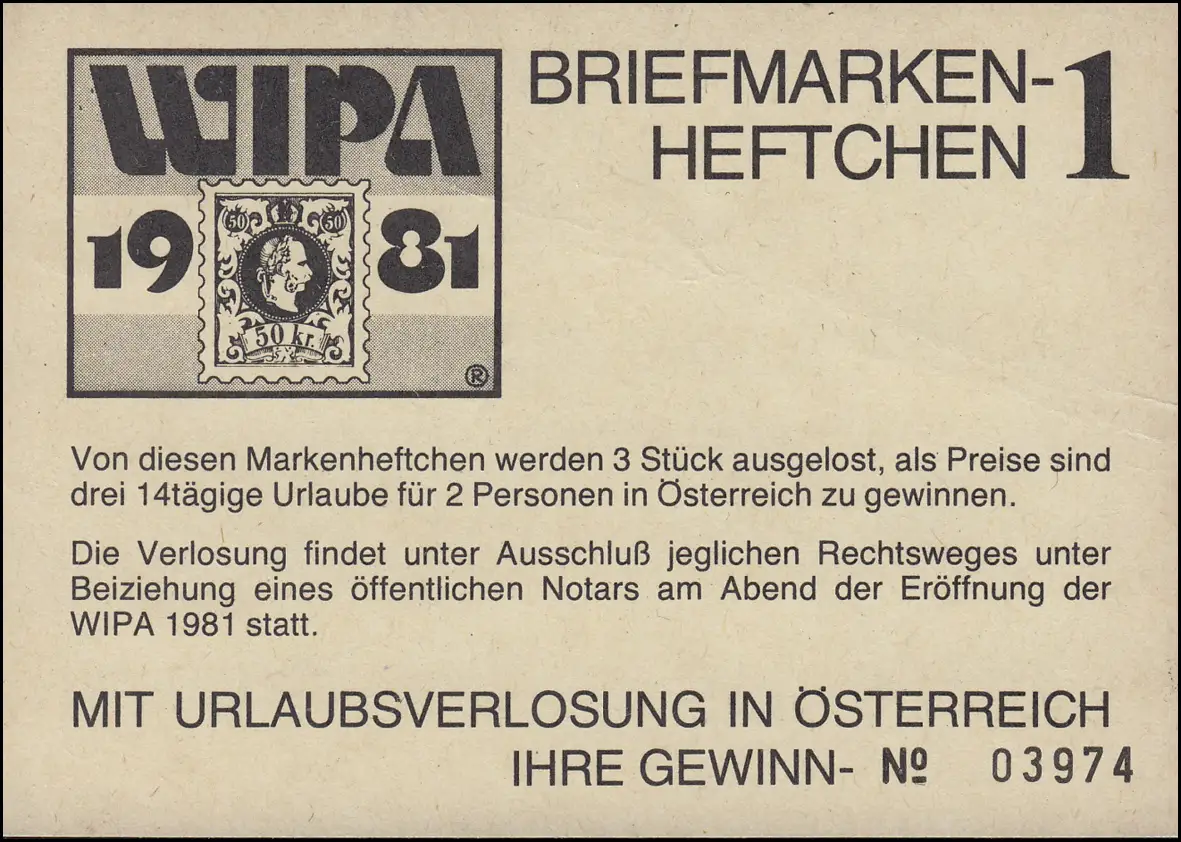 Privates Markenheftchen zur Verlosung eines Urlaubes in Österreich am Abend der Eröffnung der Weltausstellung WIPA 1981. Eingeklebter Rand-Viererblock ist postfrisch.