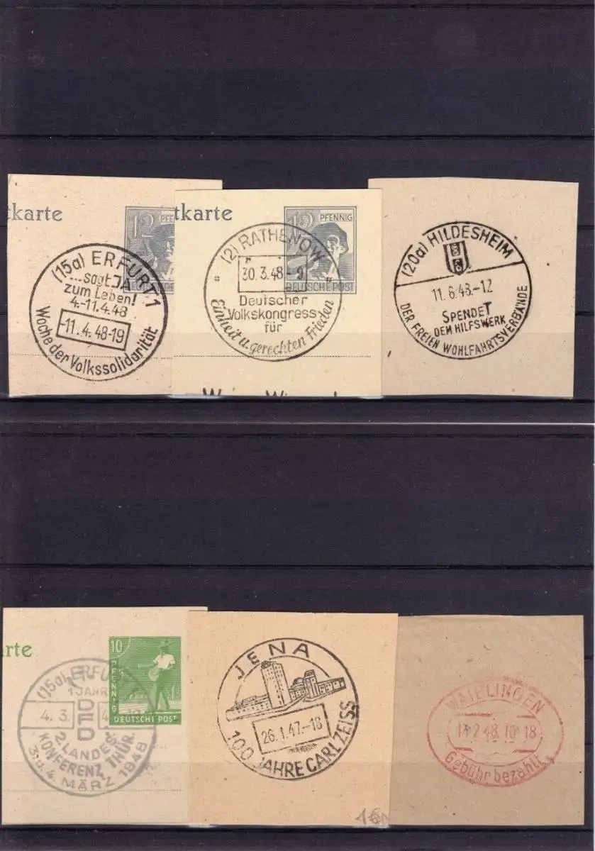 Briefstücke, sechs Stempelbelege, Deutschland 1947/48 Stempeldaten: Jena, 26.1.47 - 100 Jahre Carl Zeiss Waiblingen, 14.2.48, Gebühr bezahlt (15a) Erfurt 1, 11.4.48 - ...sagt ja zum Leben! 4.-11.4.48 - Woche der Volkssolodarität (2) Rathenow, 30.3.48 - Deutscher Volkskongress für Einheit u. gerechten Frieden (20a) Hildesheim, 11.6.48 - Spendet dem Hilfswerk der freien Wohlfahrtsverbände Anmerkungen: keine