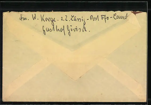 Personenbezogene Daten auf der Rückseite der Karte wurden durch blauen Textmarker unkenntlich gemacht. Die blauen Stellen sind auf die Vorderseite durchgeweicht und wirken sich negativ auf das Postkartenfoto aus