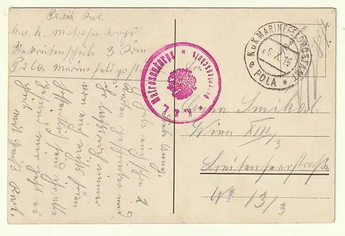 Bemerkungen: Gelaufen mit Stempel. Einkreisst. rot - neben K. u. K.MFPA 6. X. 16.