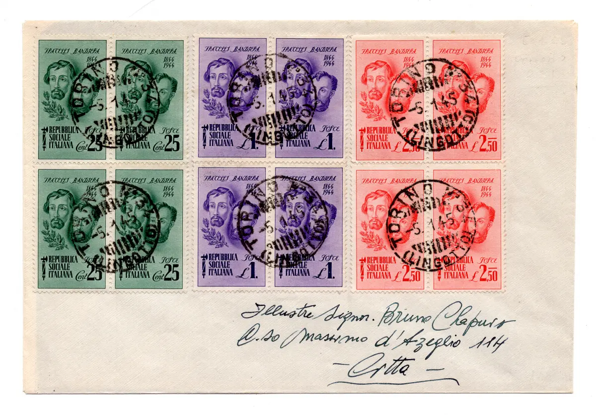 - Brüder Flagge Nr. 512/514 die komplette Viertelserie auf Umschlag, die am 5.1.45 in Turin storniert und nicht eingereicht wurde - nette philatelistische Verwendung Nr. 295/18