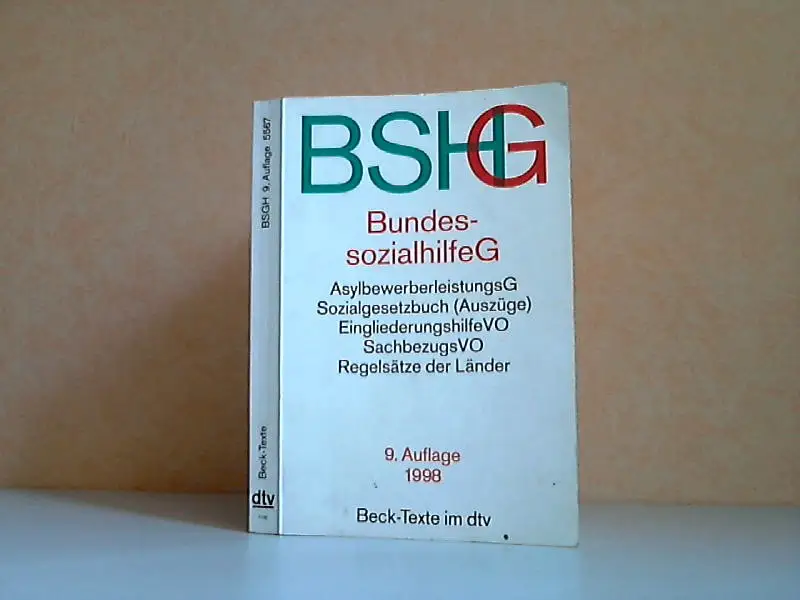 die Seiten und der Einband sind altersbedingt gebräunt, fleckig, aus dem Inhalt: l. Bundessozialhilfegesetz (BSHG) in der Fassung der Bekanntma¬ chung vom 23. März 1994 - 2. Verordnung zur Durchführung des § 22 des Bundessozialhilfegesetzes (Regelsatzverordnung) vom 20. Juli 1962 - 2a. Regelsätze nach § 22 des Bundessozialhilfegesetzes - 3. Verordnung nach § 47 des Bundessozialhilfegesetzes (Eingliederungshilfe-Verordnung) in der Fassung der Bekanntmachung vom 1. Februar 1975 - 4. Verordnung zur Durchfuhrung des § 72 des Bundessozialhihegesetzes vom 9. Juni 1976 - 5. Verordnung zur Durchfuhrung des § 76 des Bundessozialhilfegesetzes vom 28. November 1962 - 6. Verordnung zur Durchfuhrung des § 76 Abs. 2 a Nr. 3 Buchstabe b des Bundessozialhilfegesetzes vom 28. Juni 1974 - 7. Verordnung über den Wert der Sachbezüge in der Sozialversicherung (Sachbezugsverordnung - SachBezV) vom 19. Dezember 1994 - 8. Verordnung zur Durchfuhrung des § 81 Abs. 1 Nr. 3 des Bundessozialhilfegesetzes vom 12. Mai 1975 - 9. Verordnung zur Durchfuhrung des § 88 Abs. 2 Nr. 8 des Bundessozialhilfegesetzes vom 11. Februar 1988 - 9 a. Verordnung zur Durchfuhrung des § 113 Abs. 1 und 2 des Bundessozialhilfegesetzes (Sozialhilfedatenabgleichsverordnung SozhiDtAV) vom 21. Januar 1998 - 9 b. Achte Verordnung zur Neufestsetzung von Geldleistungen und Grundbeträgen nach dem Bundessozialhilfegesetz in dem in Artikel 3 des Einigungsvertrages genannten Gebiet vom 23. Juni 1998 - 10. Asylbewerberleistungsgesetz (AsylbLG) in der Fassung der Bekanntmachung vom 5. August 1997 - 11. Sozialgesetzbuch (SGB) - Allgemeiner Teil - vom 11. Dezember 1975 (Auszug) - 12. Sozialgesetzbuch (SGB) - Gemeinsame Vorschriften für die Sozialversicherung - vom 23. Dezember 1976 (Auszug) - 13. Sozialgesetzbuch (SGB) - Gesetzliche Krankenversicherung - vom 20. Dezember 1988 (Auszug) - 14. Sozialgesetzbudh (SGB) - Achtes Buch (VIII) - Kinder- und Jugendhilfe - in der Fassung der Bekanntmachung vom 15. März 1996 (Auszug) - 14 a. Sozialgesetzbuch (SGB) - Elftes Buch (XU) - Soziale Pflegeversicherung vom 26. Mai 1994 (Auszug) - 15. Sozialgesetzbuch (SGB) Drittes Buch (III) - Arbeitsförderung - vom 24. März 1997 (Auszug) - 16. Bundesgesetz über individuelle Förderung der Ausbildung (Bundesausbildungsförderungsgesetz - BAfoG) in der Fassung der Bekanntmachung vom 6. Juni 1983 (Auszug) - 17. Reichsversicherungsordnung vom 19.Juli 1911 in der Fassung der Bekanntmachung vom 15. Dezember 1924 (Auszug) - 18. Bundeskindergeldgesetz (BKGG) in der Fassung der Bekanntmachung vom 23. Januar 1997 - 19. Gesetz über die Gewährung von Erziehungsgeld und Erziehungsurlaub (Bundeserziehungsgeldgesetz - BErzGG) in der Fassung der Bekanntmachung vom 31. Januar 1994 (Auszug) - 20. Wohngeldgesetz in der Fassung der Bekanntmachung vom 1. Februar 1993 (Auszug) - 21. Sozialgesetzbuch (SGB) - Verwaltungsverfahren - vom 18. August 1980 und vom 4. November 1982 (Auszug) - 22. Verwaltungsgerichtsordnung (VwGO) in der Fassung der Bekanntmachung vom 19. März 1991 (Auszug) . Beschreibung vom Antiquariat Ardelt 1a4a ISBN-Nummer: 3423055677 Antiquariat Ardelt