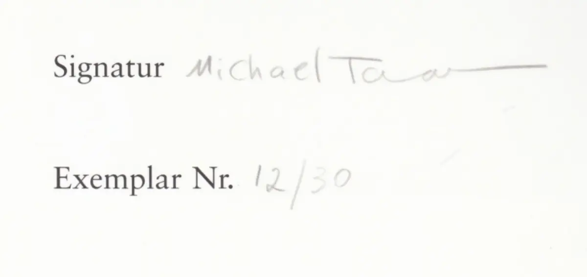 Bemerkungen: Zustand: Einband minimal berieben, Ecken etwas bestoßen, Buchdeckel minimal verzogen // Mit 24 Graphiken von M.Touma. Auflage: 30 Exemplare nummeriert und signiert; Exemplar Nr. 12/30. Signiert vom Autor