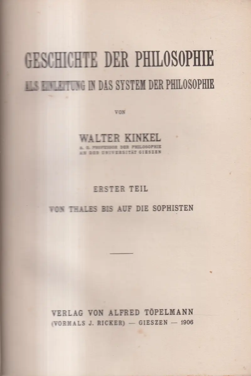Bemerkungen: Zustand: Einband etwas berieben, Ecken und Kanten etwas bestoßen, Rückenfälze stellenweise etwas eingerissen, Papier etwas gebräunt // Außentitel: Geschichte der griechischen Philosophie.