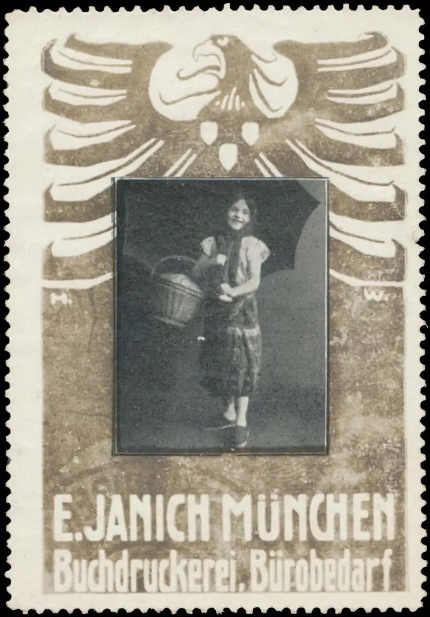 Bürobedarf, Druckerei, Dame mit Schirm, Größe/Zustand: 7x5 , beschädigt, Original alte Reklamemarke die seinerzeit für die Werbung benutzt wurde