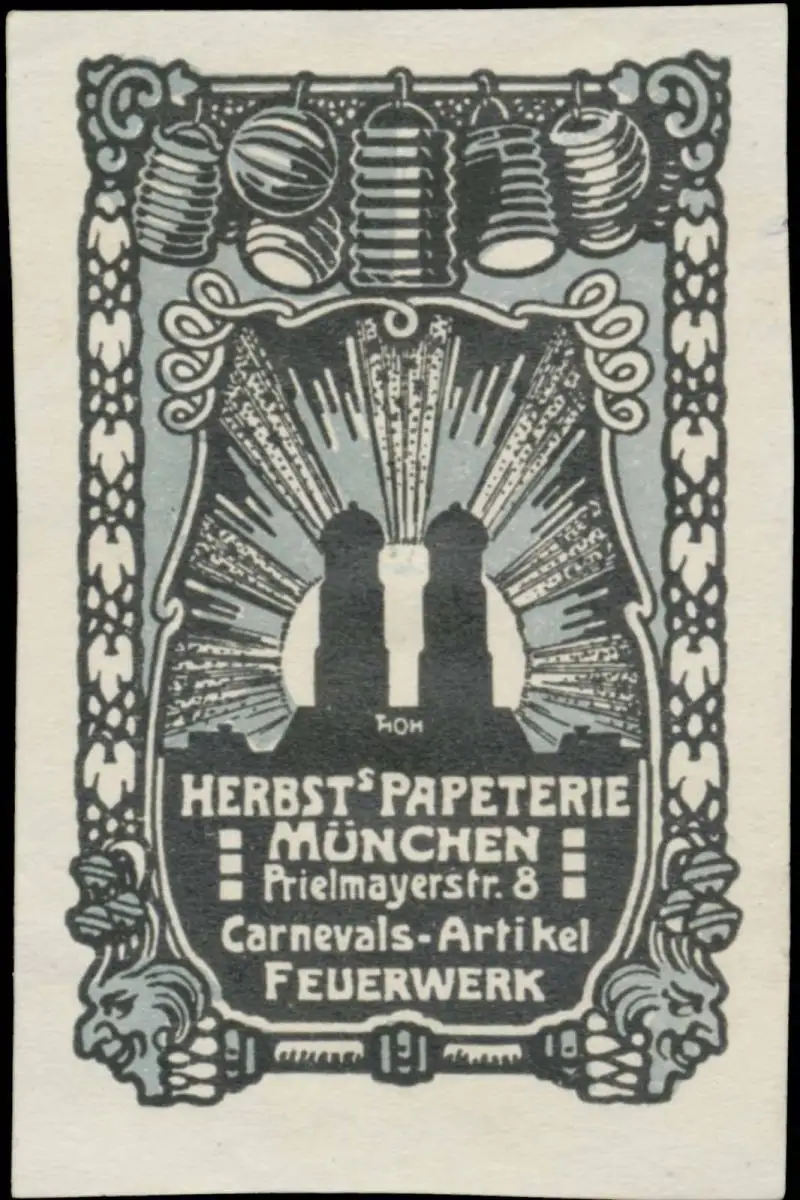 Karneval-Artikel, Feuerwerk, Frauenkirche, Größe/Zustand: 6x4 , leicht beschädigt, Original alte Reklamemarke die seinerzeit für die Werbung benutzt wurde