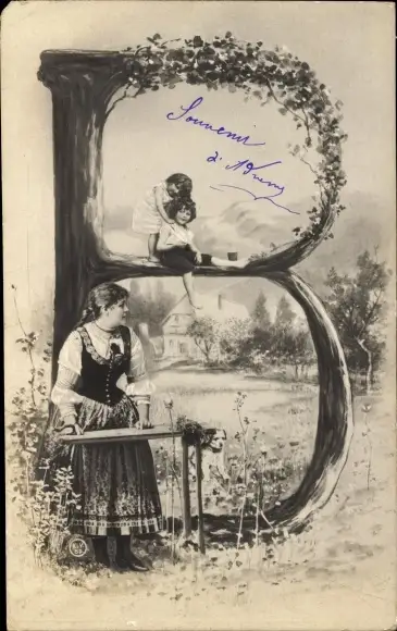 Buchstaben Ak Buchstabe B, Frau in Tracht, Kinder, Hund
