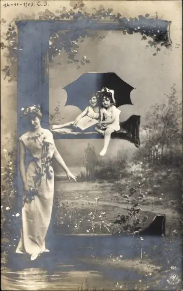 Buchstaben Ak Buchstabe E, Frau und Kinder, Schirm