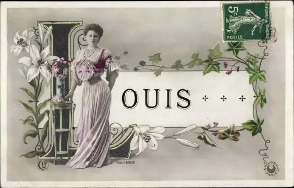 Buchstaben Ak Französischer Vorname Louis, Frau in Kleid, Weiße Blumen, Efeu