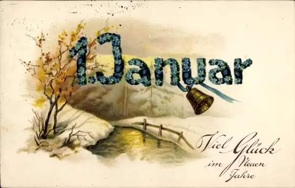 Buchstaben Ak Fröhliches Neujahr, 1. Januar, Glocke, Winterlandschaft