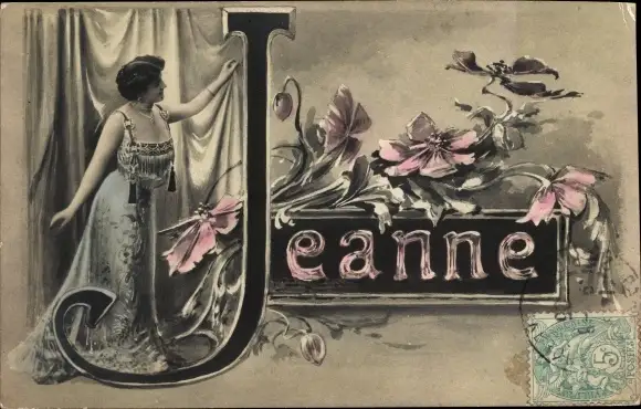 Buchstaben Ak Jeanne, Frau im Kleid, Blumen, Vorhang