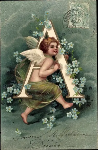 Buchstaben Präge Litho Buchstabe A, Vergissmeinnicht, Engel