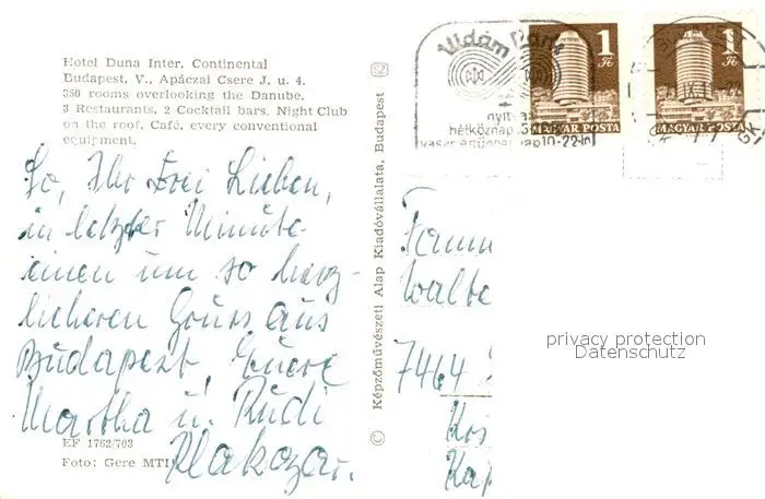 Budapest Hotel Duna Inter Continental Budapest postalisch gelaufen nach 1965 Erhaltung siehe scans [WerneD78] WernPID7