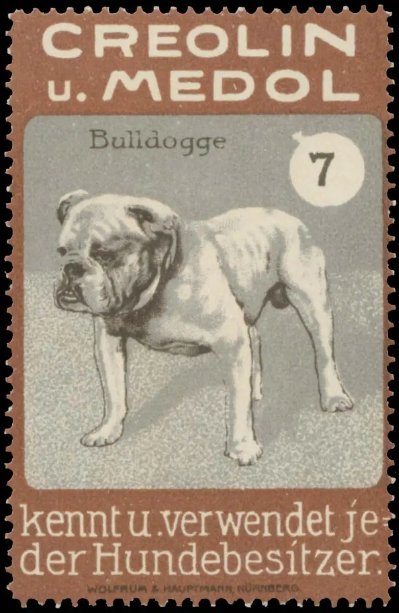 Creolin und Medol kennt und verwendet jeder Hundebesitzer, Bild 7, Hund, Druck: Wolfrum & Hauptmann, Nürnberg, Größe/Zustand: 6x4 , Fehldruck, guter Zustand, Original alte Reklamemarke die seinerzeit für die Werbung benutzt wurde