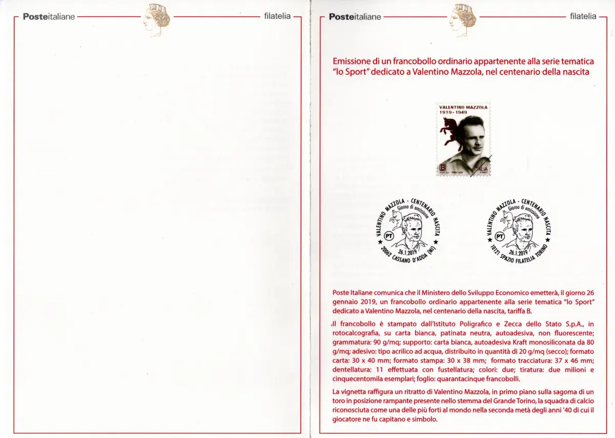 Illustratives Bulletin Gratisausgabe - Valentino Mazzola Illustrativo Bulletin der Ausgabe Valentino Mazzola vom 26.1.19 - Auf dem Bulletin ist die Ausgabe und die Stornierung auf der Rückseite wiedergegeben NICHT DER PREIS, DIE NUMMERIERUNG UND DER BARCODE FÜR DEN VERKAUF VORHANDEN - GESCHENKAUSGABE - UNGEWÖHNLICH