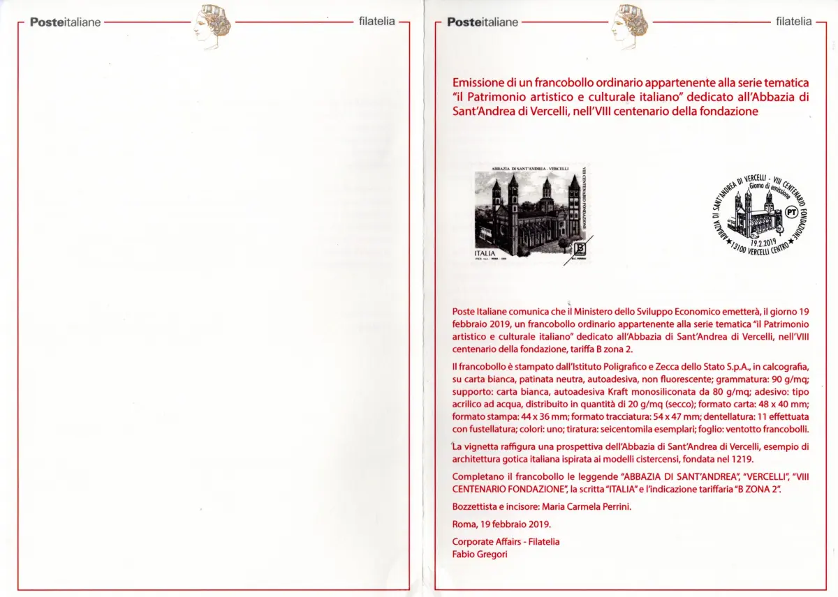 Illustratives Bulletin Gratisausgabe - Abbazia Sant'Andrea Vercelli Illustratives Bulletin der Ausgabe Abbazia di Sant'Andrea di Vercelli vom 19.2.19 - Auf dem Bulletin ist die Ausgabe und die Annullierung auf der Rückseite abgebildet NICHT DER PREIS, DIE NUMMERIERUNG UND DER BARCODE FÜR DEN VERKAUF VORHANDEN - GESCHENKAUSGABE - UNGEWÖHNLICH