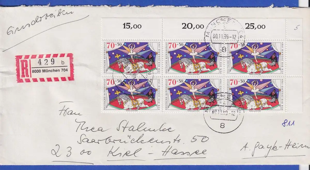 Bund 1989 Zirkus Mi.-Nr. 1412 ER-Sechserblock als MEF auf R-Brief O MÜNCHEN