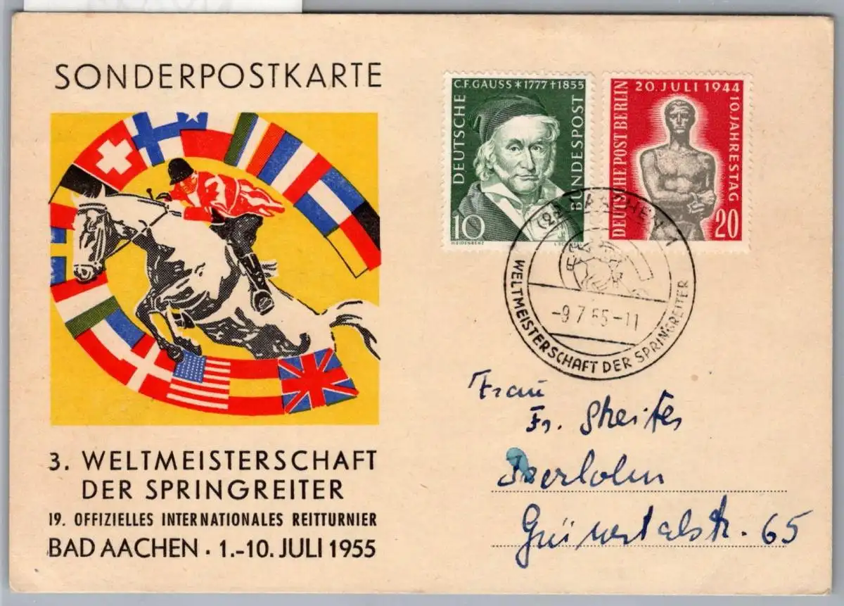 10 Pfennig Gauss und 20 Pfennig Attentat am 9.7.1955 auf Sonderpostkarte Springreitturnier 1955 von Aachen nach Iserlohn gelaufen.