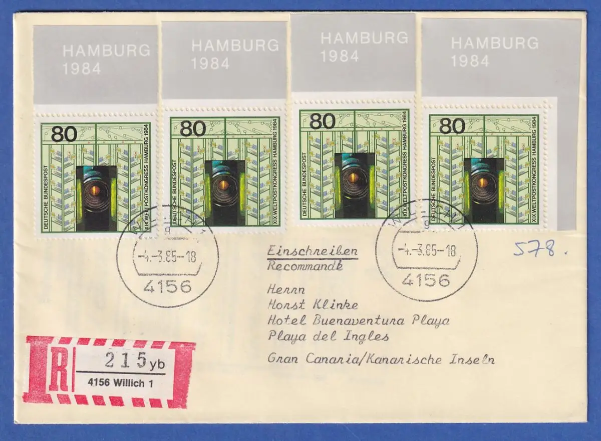 Bund Blockmarke Weltpostkongress Mi.-Nr. 1216 MEF auf R-Brief nach Gran Canaria