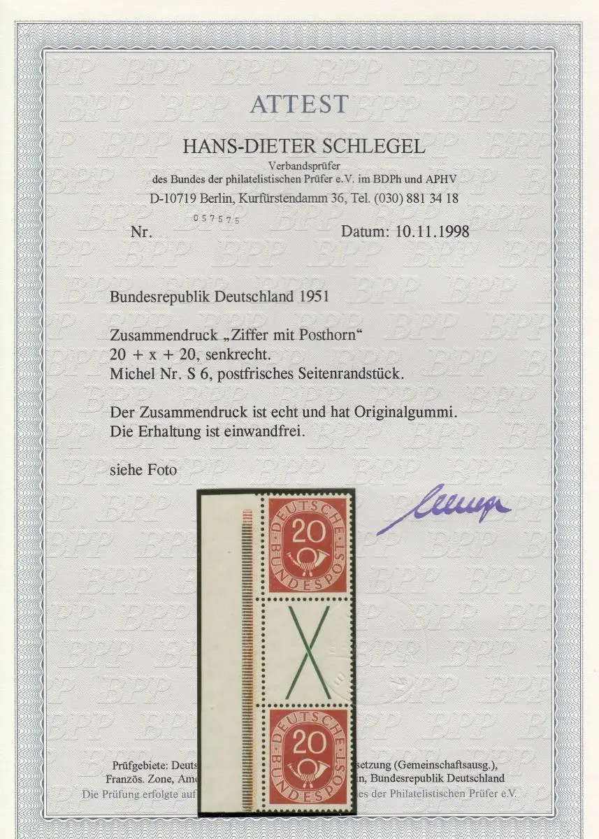 Bund: MiNr. S6, postfrisches Seitenrandstück Posthorn, BPP Attest